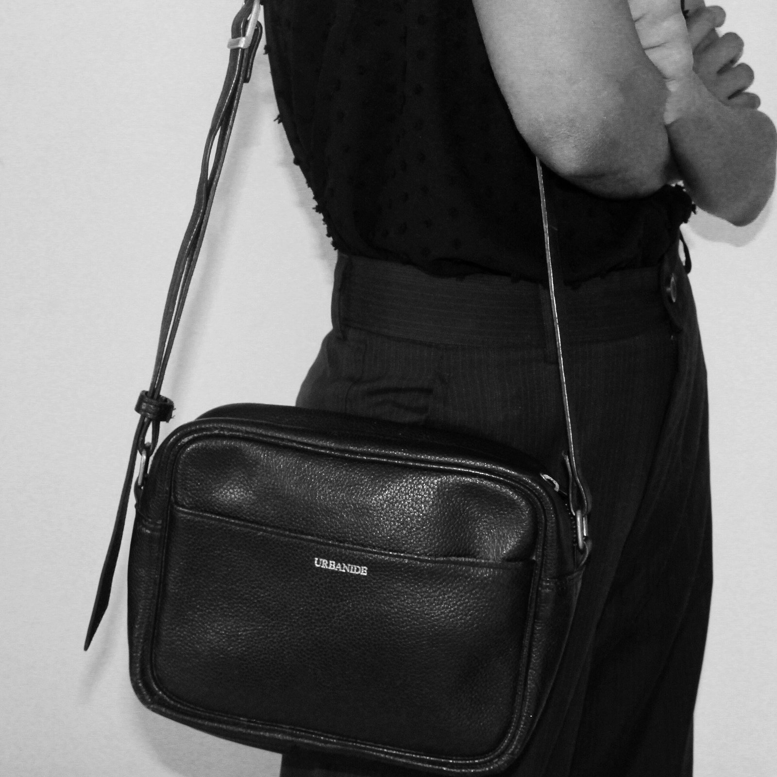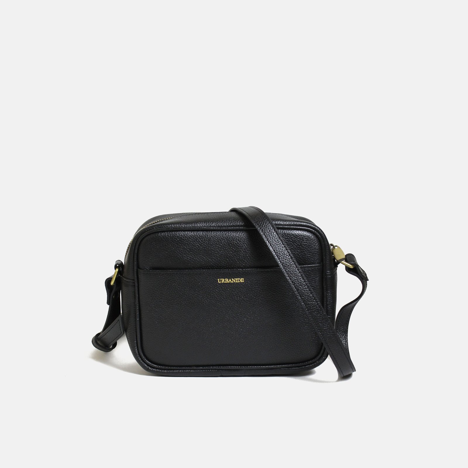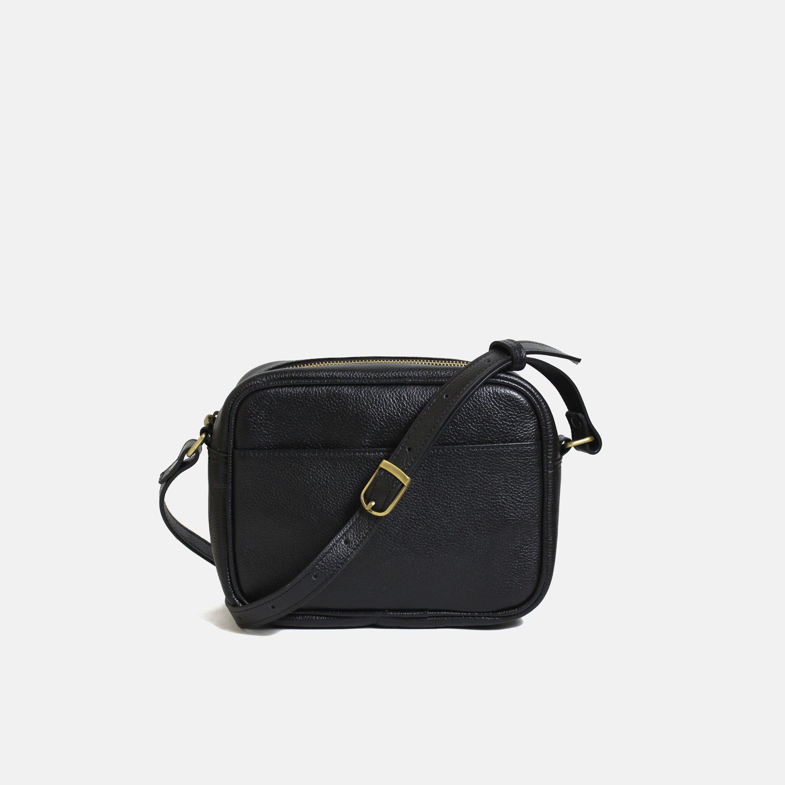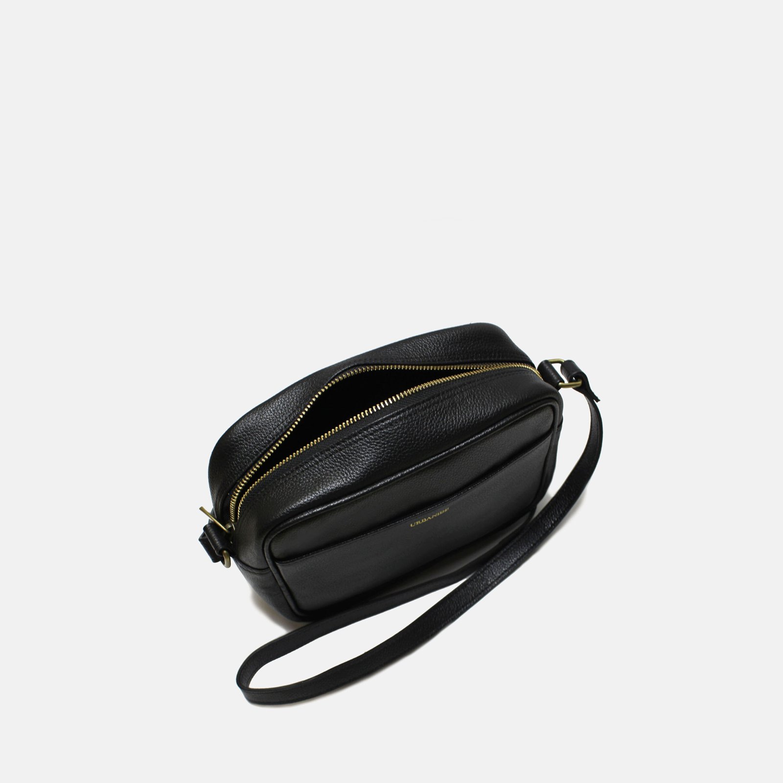 100% GRAINED LEATHER GOLD DEBOSSED MONOGRAM POLY COTTON LINING 9L X 6H X 3W INNER ZIP POCKET AND TWO SLIP POCKETS COLOR- BLACK