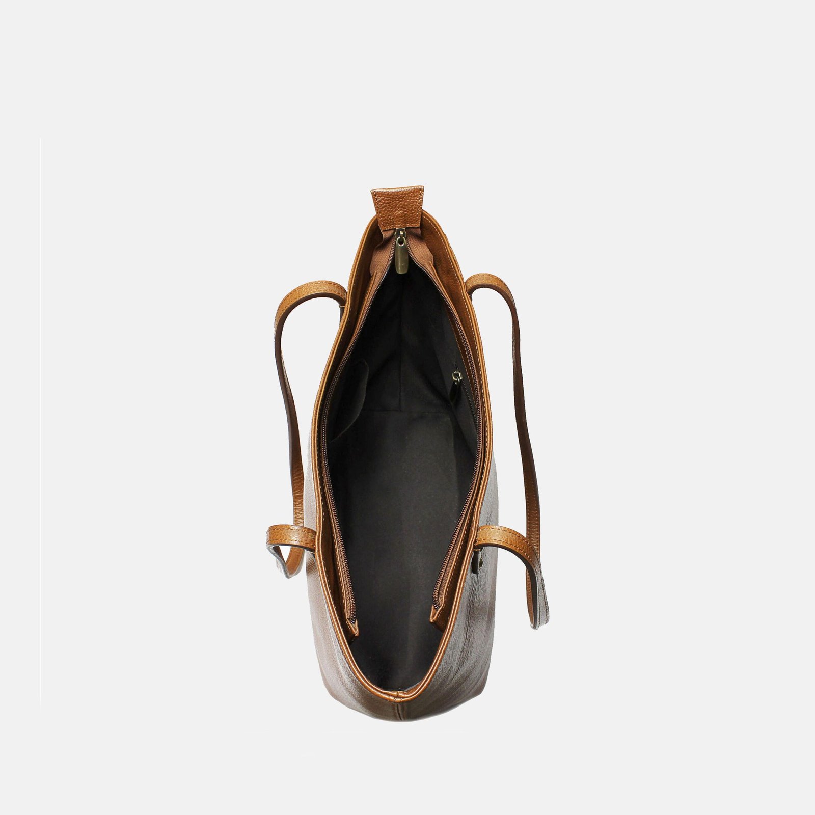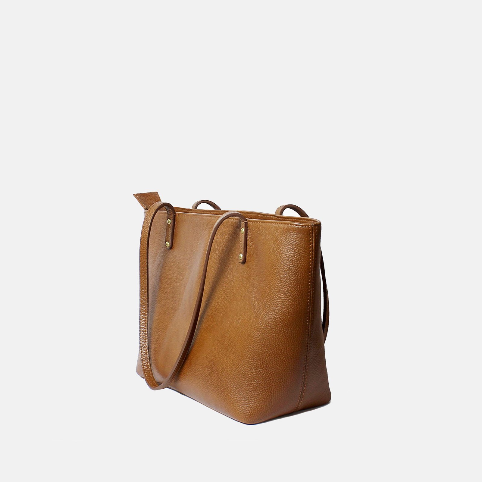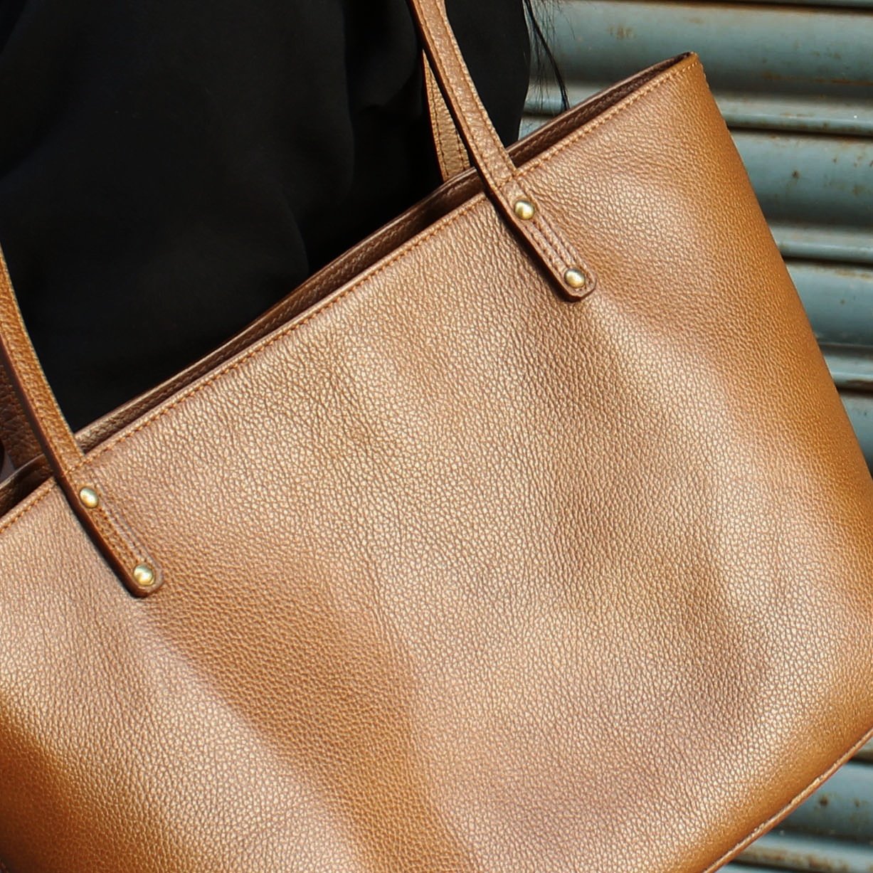 100% GRAINED LEATHER DEBOSSED MONOGRAM INSIDE POLY COTTON LINING 16L X 9H X 5W 10 INCH SHOULDER DROP INNER ZIP POCKET TWO SLIP POCKETS COLOR- COGNAC BROWN